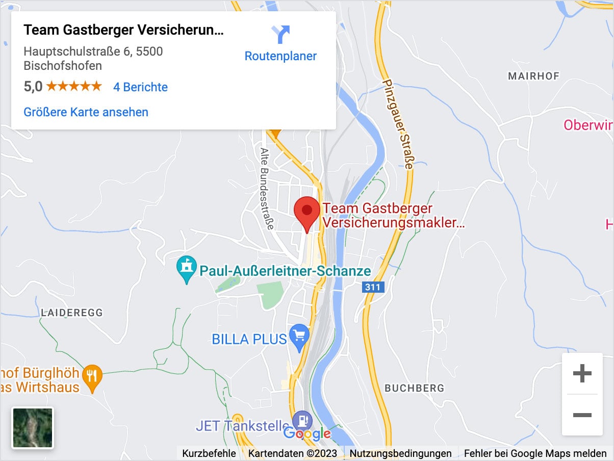 Willkommen in Bischofshofen bei Team Gastberger, Ihr Versicherungsexperte seit 1959. Unser Anspruch ist es, Sie mit Expertise und persönlicher Beratung zu unterstützen. Wir bieten maßgeschneiderte Versicherungslösungen, die auf die individuellen Bedürfnisse unserer Kunden abgestimmt sind. Unser erfahrenes Team engagiert sich dafür, Ihnen umfassenden Schutz und Sicherheit zu bieten, sei es im privaten oder geschäftlichen Bereich.
